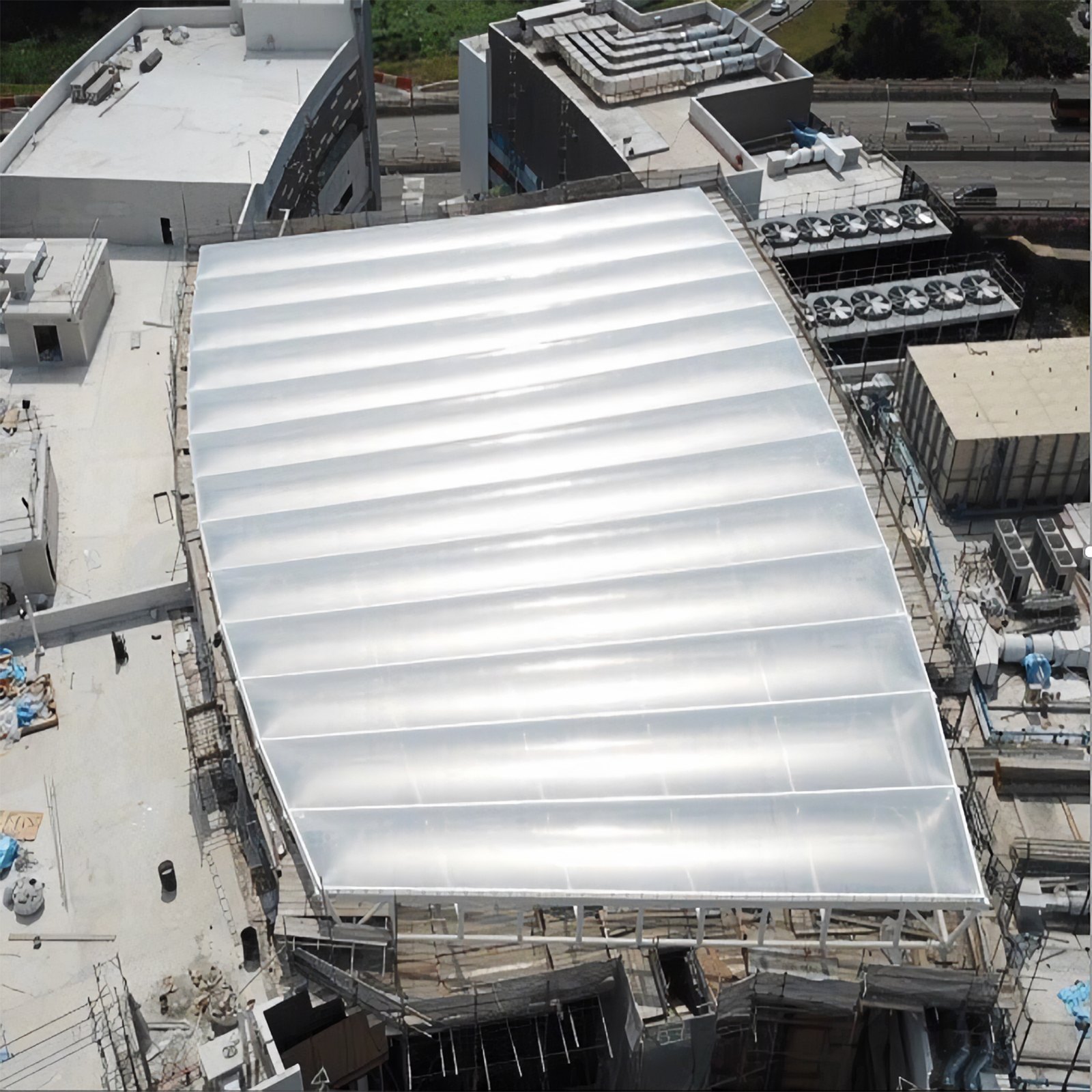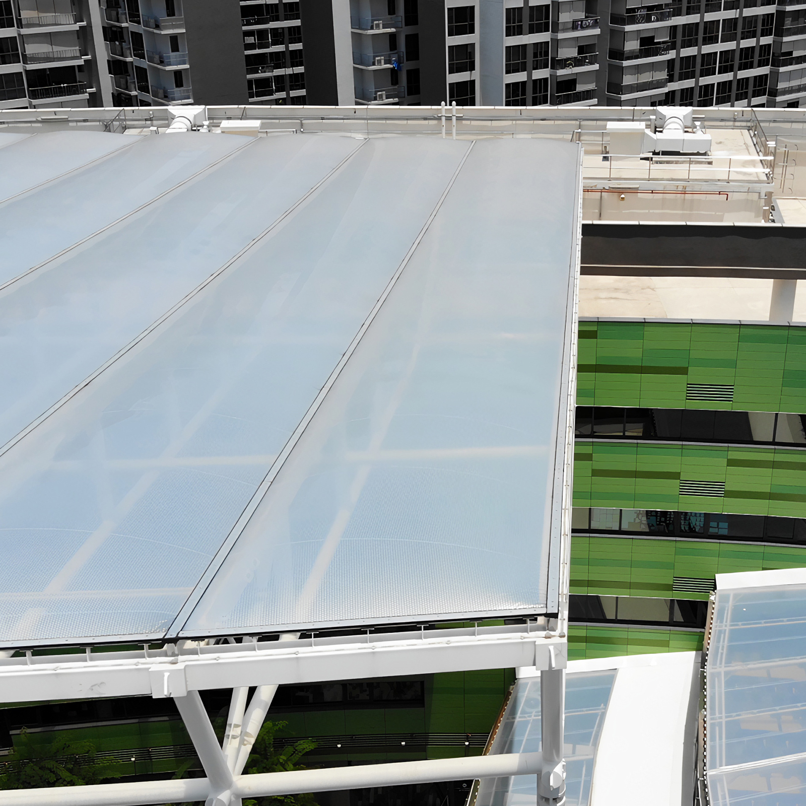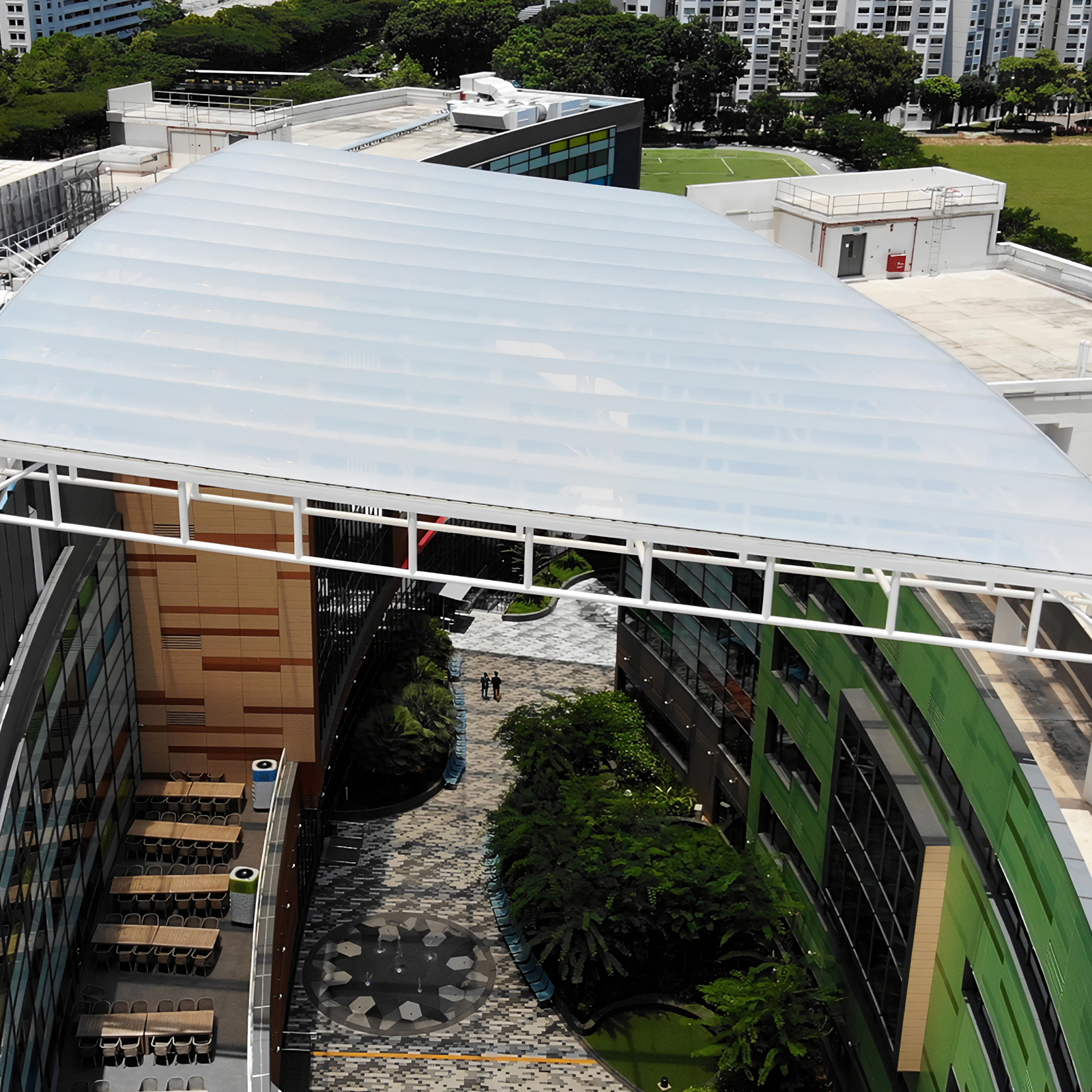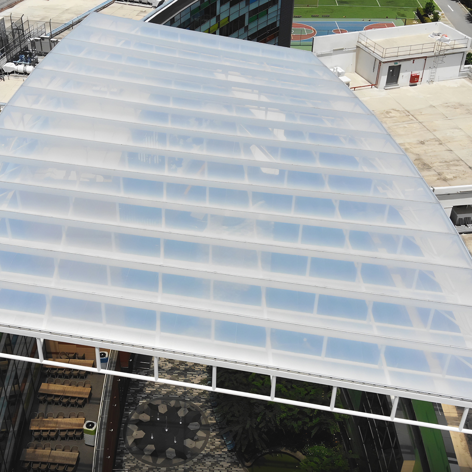 Our contribution to this project included the design, fabrication, supply and installation of the Nest canopy and canteen canopy with our ADAS PTFE and ETFE cushion systems. The resulting lightweight structure protects the central space from the elements while letting in abundant natural light.